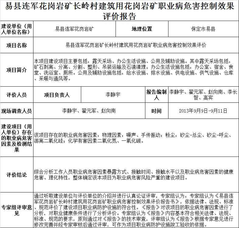 易县连军花岗岩矿长岭村建筑用花岗岩矿职业病危害控制效果评价